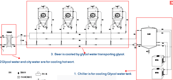 Our glycol chilling system consists of glycol water tank(normally double size than fermenters), two sets of chillers, glycol water pump, pipeline and solenoid valve for glycol water controlling.